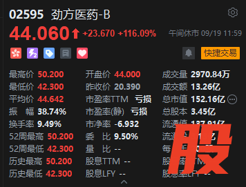 劲方医药上市首日涨超116%。据公开招股结果,劲方医药-B公开发售部分获得约2662.79倍超额认购,共接获近25.79万份有效申请。由于认购火爆,公开发售股份最终数目增至776万股,占全球发售股份总数的约8.7%。申购一手的投资者获配发股份的几率极低,概约百分比仅为0.08%。国际配售部分同样获得超额认购,倍数约为39.05倍。