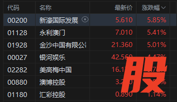 博彩股普涨,永利澳门涨超5%。高盛发表研究报告指,澳门博彩企业均将近月的博彩总收入(GGR)强劲表现归因于密集的盛事、股市带动的财富效应、签证政策放宽,以及泰国及菲律宾安全隐忧持续,令更多内地旅客选择港澳作为目的地。对于十一黄金周,基于酒店预订几乎‘爆满’,以及与客户沟通的情况,博企普遍预期需求强劲,而全国运动会则不会对博彩收入有显著影响。整体而言,业界预期强劲增长动能将在今年余下时间持续。该行预期澳门2025全年赌收按年增长9%,意味今年9至12月按年增长14%,2026年则增长7%。
