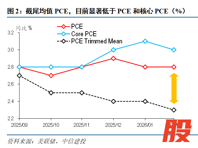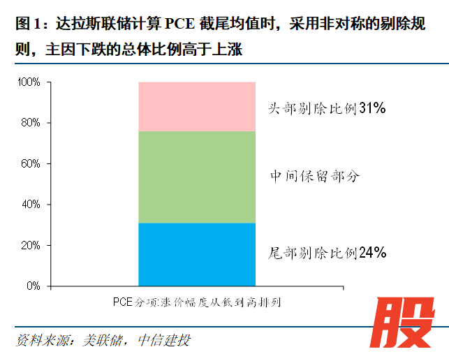 截尾均值PCE,同时剔除涨幅和跌幅过大的分项,保留中间部分;历史经验看,能够很好代表整体通胀的长期走势。这一指标目前由达拉斯联储计算,将PCE全部分项中,涨跌幅的下尾部24%和上尾部31%的部分剔除,计算中间部分的均值,由此产生的通胀指标被证明优于更传统的“排除食品和能源”的核心通胀指标。其逻辑和体操比赛打分类似,即去掉一些最高分,再去掉一些最低分,计算剩余均分,排除异常值干扰。