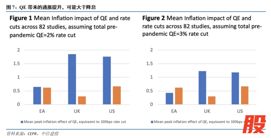 但是,学术研究角度看,存在一些证据,指向QE相较传统降息,带来的通胀影响更大。例如,CEPR总结多项研究结果发现,降息100bp对美国通胀的最大影响仅为0.7%左右,而相同刺激的QE带来的推升幅度接近1.8%。