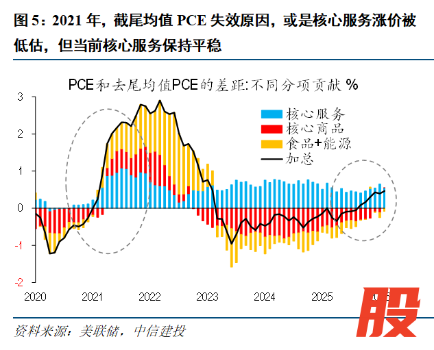 因此,后续关键,需要观察造成截尾均值PCE更低的分项是否存在持续涨价能力。拆分2021年造成PCE和截尾均值PCE差距的原因,可以看到:当时不仅食品、能源这类波动大的分项被截尾均值剔除,大量核心商品和核心服务的分项,也被剔除,这些涨价粘性较强,可能是截尾均值失效的主要原因。