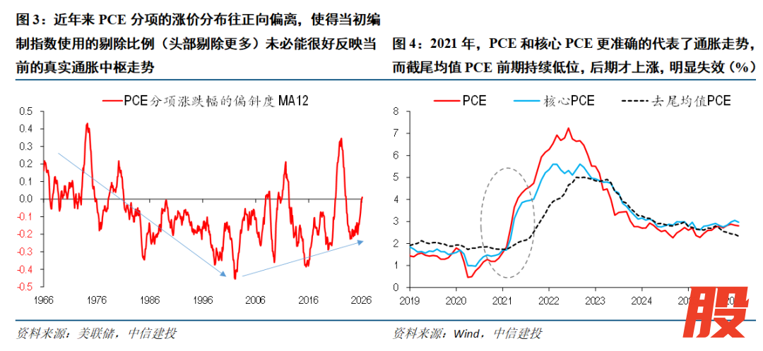 典型例子如2021年,PCE和核心PCE大幅上行,但截尾均值PCE维持平稳,事后来看,显然通胀早已失控,后者低估了风险。